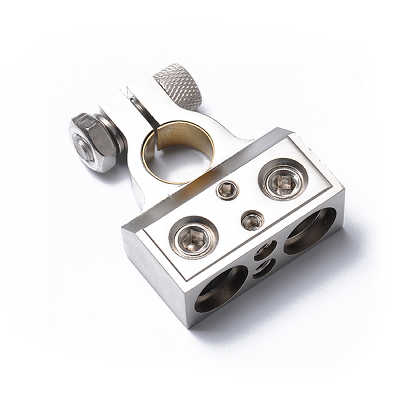 — Zinc alloy with Sand nickel finish.– Two 1/0 Gauge and Two 8 Gauge Inputs.– Fits both positive or negative posts.– Volt Compatible (also with 10-24 volts DC).
