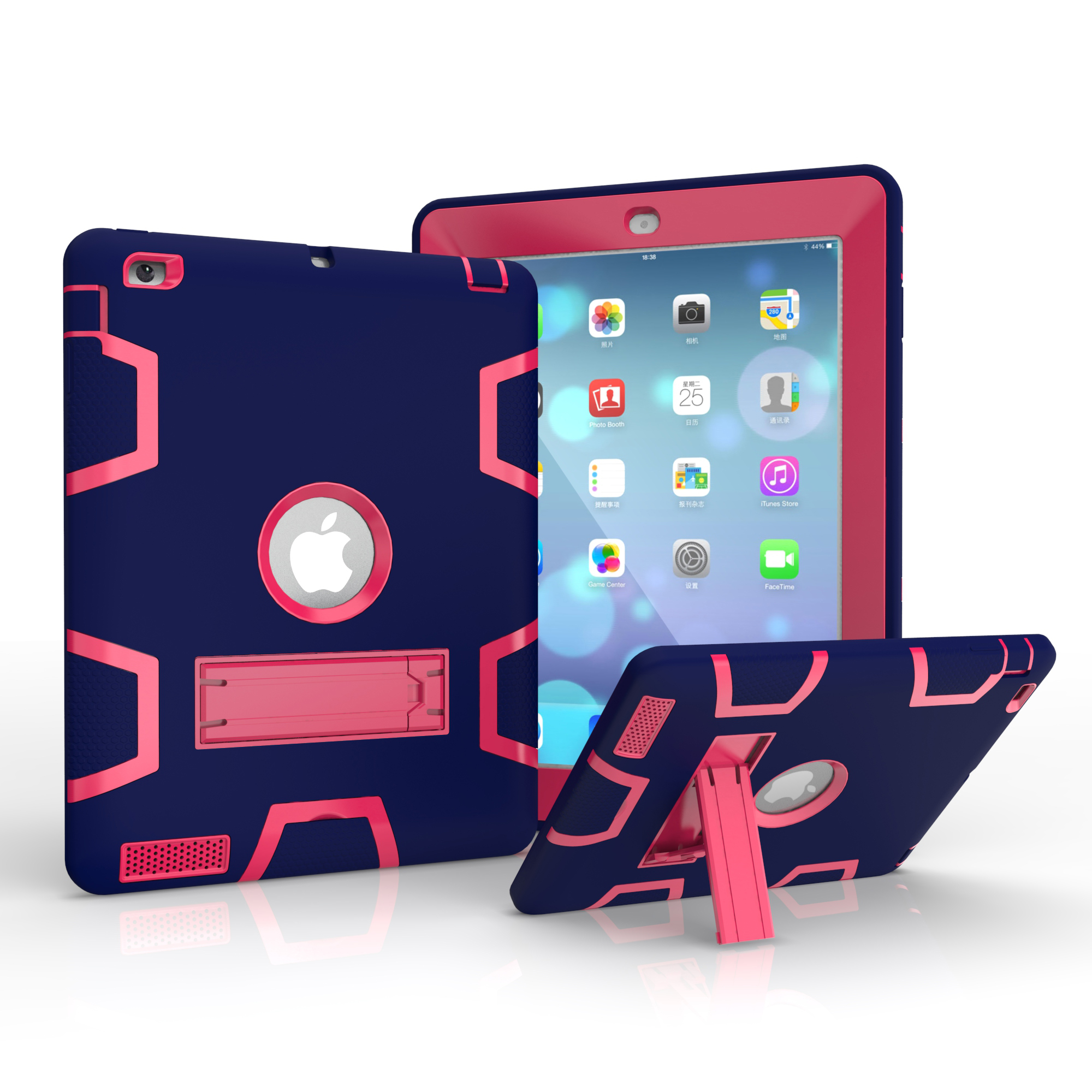For iPad 2/3/4 PC+ Silicone Hit Color Armor Case Tri-proof Shockproof Dustproof Anti-fall Protective Cover Navy + Rose red