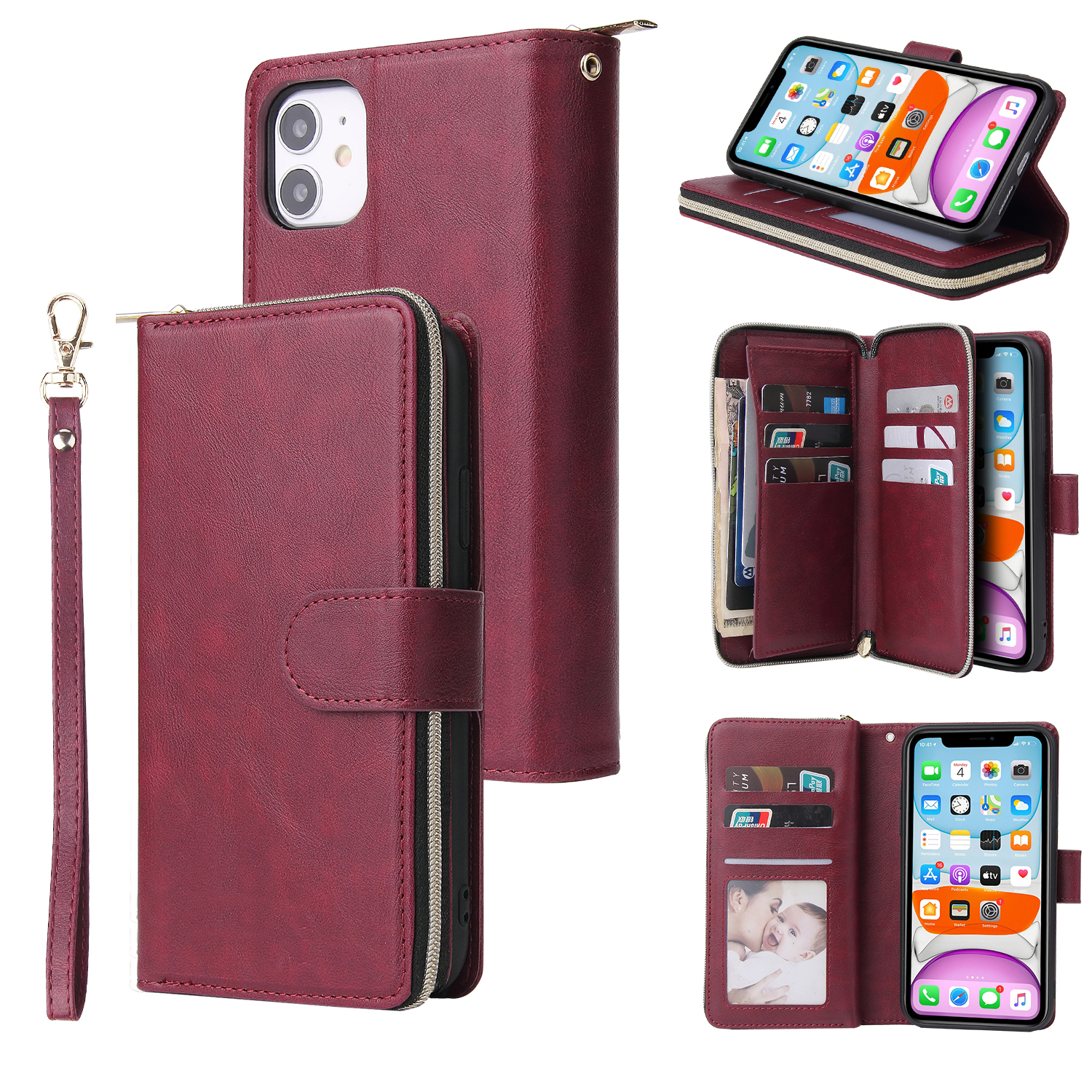 For iphone X/XS/XS MAX/11/11Pro Pu Leather Mobile Phone Cover Zipper Card Bag + Wrist Strap Red wine
