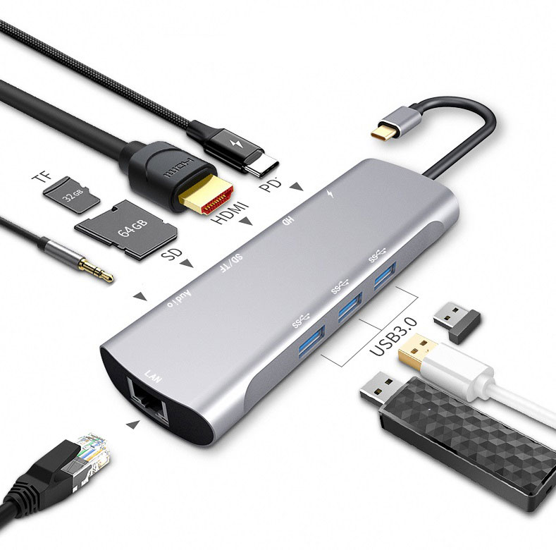Hub Adapter USB C to Hdmimi C to VGA? Rj45 3.5mm Aux Socket with SD TF Pd Plug USB3.1 Hub for Macbook Pro USB-C Hub Nine in one