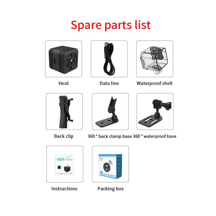 SQ29 Mini Camera Waterproof Shell Back Clip 360Dgree Back Clamp Base Waterpoof Base Data Line User Manual black