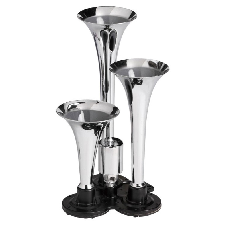 The single horn is constructed out ofquality material to ensure maximum strength.Three trumpet chrome air horn with electric valve, flat base – Fit for car, vehicle, yacht, boat, buses etc.With a polished red compressor and shiny chrome horn they cast an
