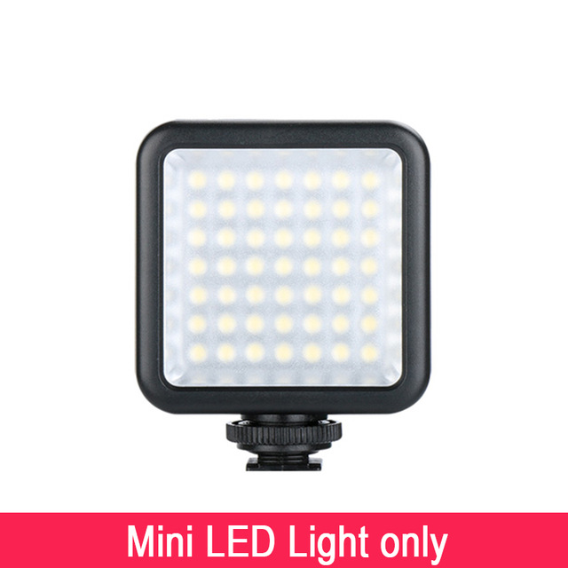 Mini LED light with 49pcs superior LED beads, lifetime can reach 50,000hrs.5.5W high power, 0 – 100% dimmable for different brightness.6000K natural and soft white light, CRI??90 present vivid object color.With hot shoe base on three sides, you can interl